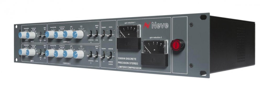 The Neve 33609 Stereo Compressor offers comprehensive limiting and compression facilities for music recording, mastering, post production and broadcast applications. The combination of hand-wired transformers and gain reduction circuitry produces a sound quality which is often duplicated, yet seldom achieved by any other compressor / limiter. Coupled with the unit's unparalleled ease of use, this inimitable sound quality has made the 33609 a worldwide studio standard for three decades.