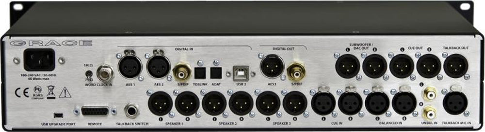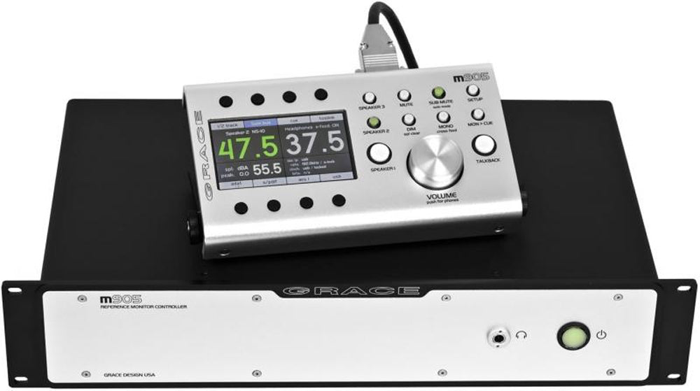 The Grace Design M905 is a professional-grade reference monitor controller built for critical listening, precision routing, and full system control in high-end studio environments. It serves as the centerpiece for complex monitoring setups, offering reliable control over multiple audio sources, speaker outputs, and headphone mixes. The system includes two main components: the Audio Control Unit (ACU), which handles all audio connections, and the Remote Control Unit (RCU), which provides intuitive control via a color display, tactile buttons, and a large rotary encoder.