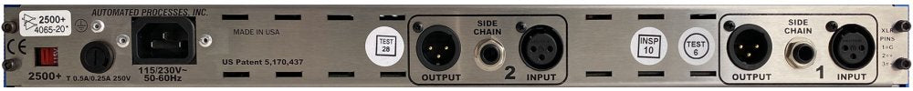 Among the many qualities which make the 2500+'s unique is its use of API's patented THRUST circuit for a chest-hitting, punchy bottom end. Another distinctive feature of the 2500+ is its selectable "old" or "new" compression, with the old style using the "feed back" type of compression found in the API 525, and the new style using the "feed forward" type in which the compressor side chain is fed directly from the unit input. Additionally, the output stage of the 2500+ offers an auto-makeup gain button that permits the user to vary the threshold or ratio while automatically maintaining a constant output level.