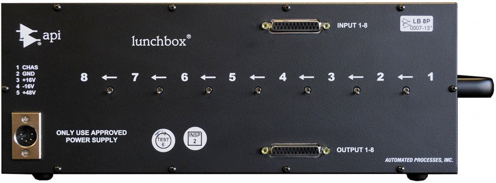 The lunchbox utilizes an external power supply. API makes several modules for the lunchbox, including the 512c Mic Preamplifier, the 525 Compressor, the 527 Compressor, the 550A 3-band EQ, the 550b 4-band EQ and the 560 Graphic EQ. Combinations of these modules make perfect stereo recording packages (two 512cs and two 550bs) or vocalist's box (one 512c, two EQs and one 527).