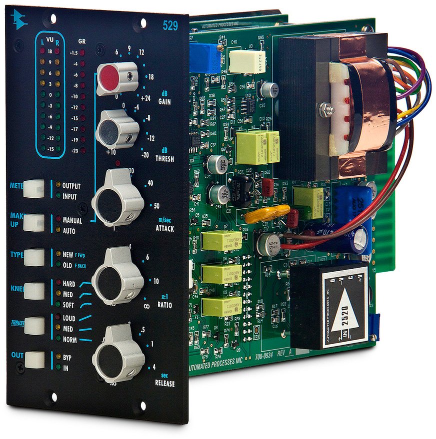 The new 529 Stereo Compressor combines the unmistakable sound of API's compression technology with the convenience and popularity of the API 500 Series format. Carefully designed to deliver a wide range of compression options, the 529 delivers warmth, clarity and punch, whether used for subtle adjustments or heavy compression effects.