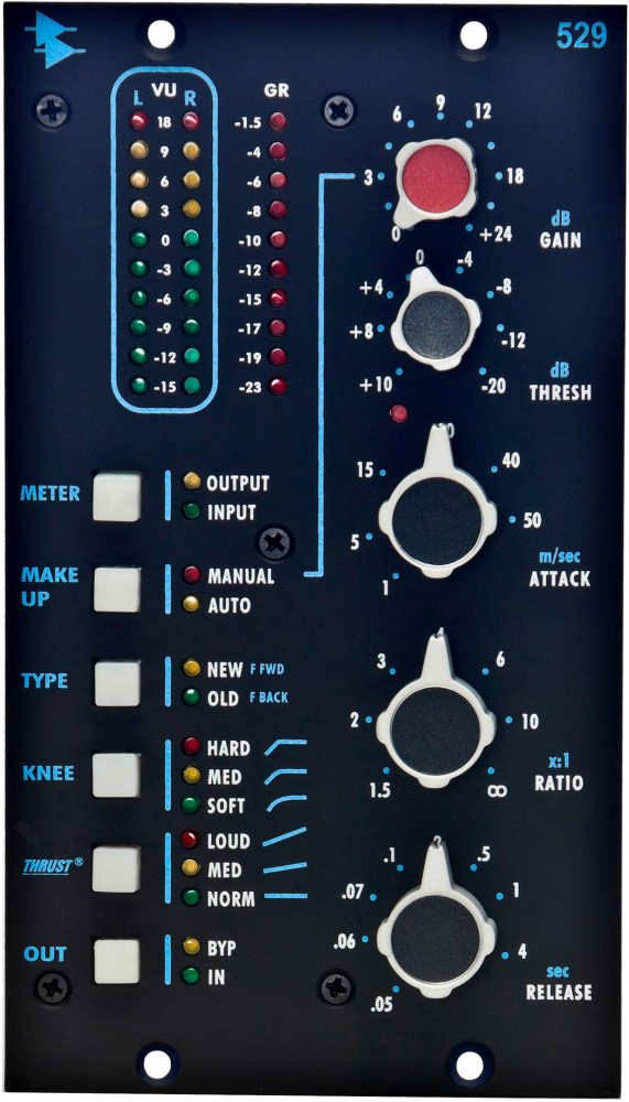 Based on the unprecedented success of the 2500, the 529 takes many of the features and controls from API's famous stereo compressor and puts them into the first dual slot 500 series module from API. This stereo compressor features API's patented THRUST circuitry for a punchy low end, along with an Old/New switch that lets you choose between classic and modern compression characteristics: Old for vintage-style feedback compression and New for today's more common feed-forward compression. The Auto-makeup Gain button lets you adjust ratio and threshold controls without affecting the output level. Using API's discrete op-amps and transformer technology, the 529 delivers the legendary analog sound of API.