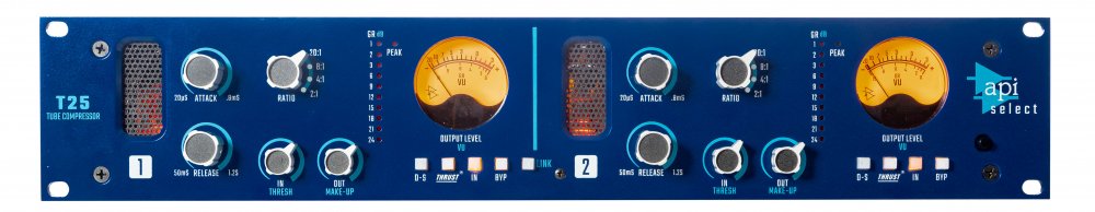 The API Select T25 is a classic 2-channel, FET feedback-style compressor/limiter with a Class-A tube output stage that utilizes a custom API transformer. Built with 12AT7WC and 12BH7 dual-triode vacuum tube, the T25 represents a new direction in API's line of compressors. It offers the user a powerful and flexible feature set, including the ability for use in either dual mono or stereo mode, and is carefully engineered to deliver classic tube performance. The T25 excels at delivering the unmistakable sound of API and features our industry-exclusive Five Year Warranty.