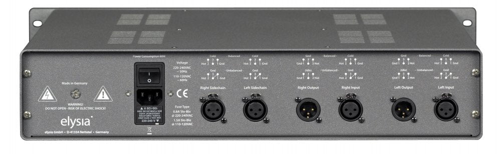Each of both linkable channels offers a switchable Auto Fast function that allows very fast yet distortion-free compression without any artifacts. The Anti Log circuit generates explicit compression effects such as pumping and breathing. As the mpressor is a true feed forward design, it also allows negative ratios which result in the most ex-treme over-compression effects. The Niveau Filters can change the character of a track from subtle to striking with the possibility of a continuous frequency shift. The Gain Reduction Limiter is a novel feature that lets the user choose the maximum amount of Gain Reduction he wants to draw from the unit, and this at the twist of a knob. The switchable external sidechain inputs make for further flexibility in terms of compression behavior.