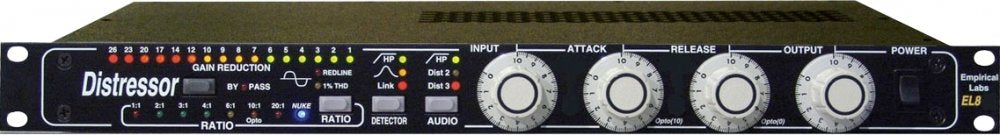 The Distressor is the product that started it all for Empirical Labs. Born of founder Dave Derr's love of classic compressors like the 1176, LA-2A and Gain Brain (among others), the Distressor incorporates his favorite sonic characteristics of these, along with other unique and interesting features that have made it a staple for audio engineers all over the world. With over 22,000 units in the field, it's safe to say that the Distressor is one of the best selling high end compressors of all time....if not THE best selling. A prominent recording engineer recently wagered that there probably was not a top 40 record made in the last five years that didn't have at least one Distressor on it. Besides providing a wide range of control and a unique feature set, the Distressor offers a warm, vintage sound by using a custom designed gain control circuit. This "warmth" or "vintage sound" has become a major issue in the last few decades, as the super clear and linear digital technology does next to nothing to soften "harsh" sounds, nor emphasize the bass frequencies in music sources. Conversely, older analog tape, vinyl records and tube equipment could not be prevented from coloring the sound, often to the frustration of recording engineers. However, many people now realize that this coloring can be extremely pleasant and musical. Digital technology is often referred to as "cold" and "brittle" among other terms (although we prefer "unforgiving"). All eight of the Distressor's curves are unique and distinctive, from the 1:1 mode that simply warms up signal with low order harmonics without intentional compression, to the "Nuke" setting - a brick wall limiting curve that shines on live drum room mics. Each curve has its own personality and several actually use different circuitry, and are effectively different compressors. Most exceptional is the 10:1 "Opto" ratio which uses separate detector circuitry to emulate the oldest (and valued) "light controlled" devices, such as the LA-2A. Another large part of the Distressor's personality and power derive from three modes that color the signal, even without compression. These extended audio modes were designed to allow emulation of some very old and expensive vintage compressors & limiters, and let the Distressor deliver a classic "knee" sound all its own by providing user programmable, warm harmonic distortion. In addition to the basic distortion mode, Distort 2 emphasizes tube-like 2nd order harmonics, while in Distort 3 setting the distortion becomes dominated by 3rd harmonics more closely resembling tape. Two HP filters - one in the audio path, one in the detector path - are also available to help with low frequencies that can cause pumping and breathing. The Distressor is available in either its original form (EL8), or in a modified version (EL8-X) with two additional functions - British Mode, and Image Link.