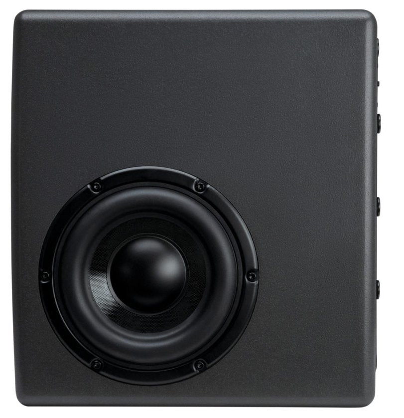 The Footprint02 looks a lot like its big sister: side-mounted dual opposing paper cone subwoofers; dual ring radiator tweeter and aluminum cone midrange driver set in an aluminum front sub baffle; sleek, rounded corners and edges, minimizing cabinet diffraction. The front baffle speaker configuration is instantly recognizable, with the tweeter positioned below the midrange woofer, an unusual geometry that generates the acoustic focus at the center of the cabinet.