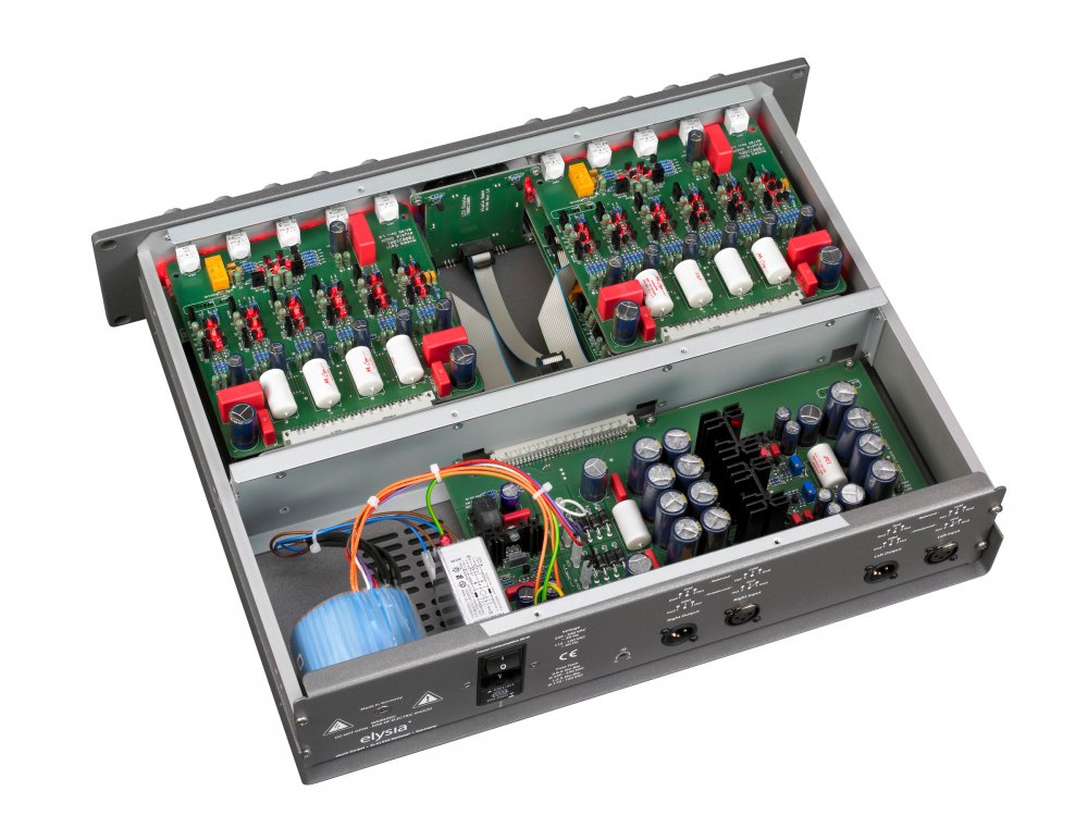 The circuit design of the museq is completely based on discrete analog technology. The entire signal processing is realized with single transistors in permanent class A mode, and even the power supply is composed of fully discrete circuits. An oversized transformer, selected capsuled conductive plastic potentiometers as well as special current feedback amplifiers are part of the technical refinement. The combination of these elements aims at maximum signal quality and guarantees clean and powerful sound characteristics even when extreme settings are used.
